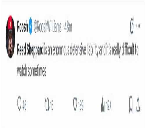 休媒疯狂朝着谢泼德开炮,Roosh:里德-谢泼德是个超级的防守漏洞,有时看着他打球真是让人难受。