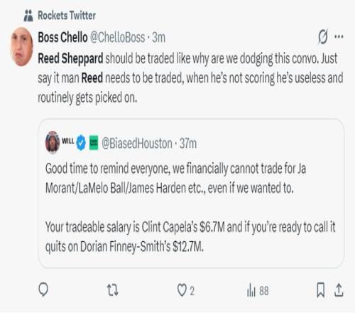 休媒:我提醒一下大家,从薪金的角度来看,我们没有可能交易得到莫兰特、三球、哈登这样的球员,我们可以交易的资产卡佩拉670万、芬尼史密斯1270万而已。