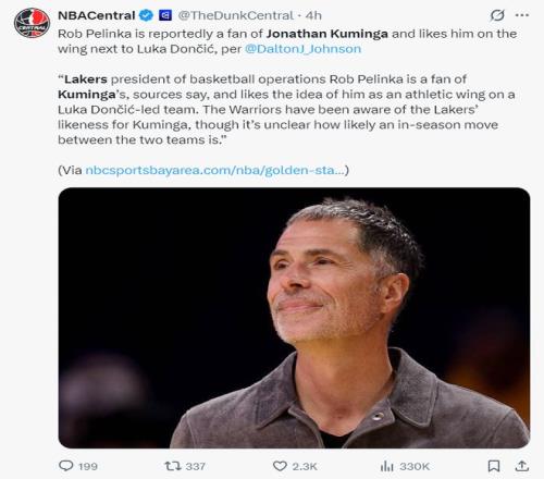北京时间1月16日,根据《洛杉矶时报》记者Dalton Johnson的报道,湖人GM罗勃-佩林卡是库明加的粉丝,他希望得到一位运动能力出众的侧翼锋线搭档东契奇,勇士队也知道湖人队非常有兴趣交易得到库明加,但目前尚不清楚两队在本赛季交易的可能性有多大。