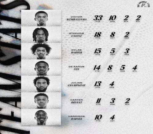全场比赛文班亚马30分钟,21中5,三分7中0,罚球4中4,拿到14分10篮板2助攻4犯规1失误,命中率23.8%,三分命中率0%,真实命中率30.8%,正负值-14,作为一名身高2.24米的内线这个效率值拉到极致。