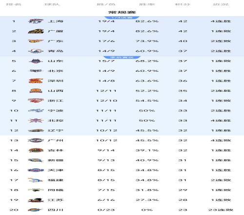 常规赛第一阶段结束之后的最新积分榜排名: