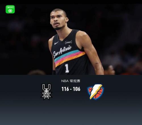 第四节,前半节双方保持混战拉锯,雷霆依靠三分得分,马刺持续冲框回应,节中段雷霆持续冲框不中,马刺连续失误,后半节上来马刺连续三分尝试不中,雷霆抓住机会追至4分,马刺卡斯尔、文班亚马联手得分稳住局面再度拉大至两位数,全场结束,马刺116-106战胜雷霆。
