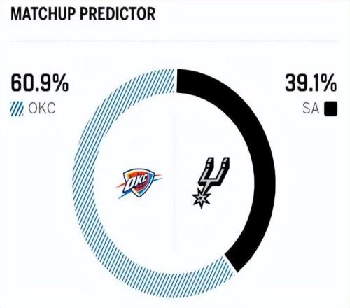 赛前,美媒ESPN对本场比赛进行了胜率预测,马刺队胜率仅有37.6%,意外不被看好,伤兵满营的雷霆队胜率依旧高达62.4% ,让人疑惑。