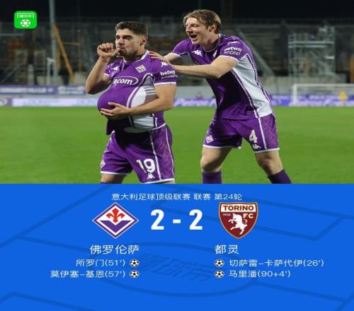 北京时间2月8日意大利足球顶级联赛第24轮,佛罗伦萨主场迎战都灵。比赛中,都灵率先取得进球;随后佛罗伦萨连入两球反超比分;但都灵在比赛尾声阶段再度破门,最终两队2-2握手言和。佛罗伦萨方面所罗门、莫伊塞-基恩各入一球,都灵则由切萨雷-卡萨代伊、马里潘完成破门。