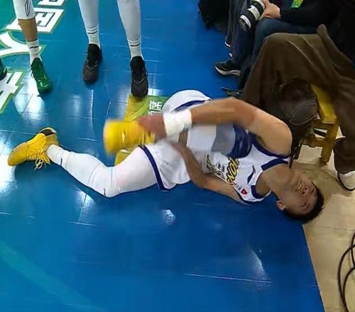 双方第一节比赛,还有5分39秒时,广厦队7-16落后山西队9分,此时,孙铭徽持球快速冲到篮下,想打一个快攻,然而,冲进禁区内上篮,孙铭徽却突然倒在地上,显得十分痛苦,只见他的双手捂住了自己的脚,显然,在突破的时候,他出现了崴脚的情况……