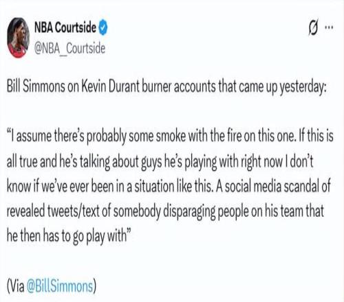 名嘴比尔-西蒙斯也在播客节目上谈到了近期爆出的杜兰特小号事件:“我觉得这事无风不起浪。如果全是真的,而且他在吐槽现在还在并肩打球的队友,那我们可能从没见过这种局面 —— 社交媒体丑闻曝光,实锤他在贬低自己的队友,转头还得跟他们一起打球。”