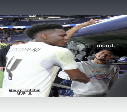 赛后,贝林厄姆在自己的社交媒体上分享了一张自己与楚阿梅尼握手的照片,并在图中写道MVP,然后自己脸上方则写着自己的心情就像这样。