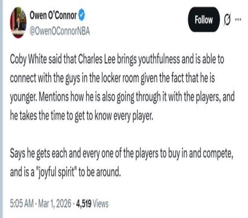 替补奇兵怀特则称赞了主帅查尔斯-李:“他很年轻,能够在更衣室与球员们打成一片,他能做到和球员们感同身受,会花时间去了解每一个人,这让所有人都全心投入、全力竞争,整个团队都充满积极快乐的氛围。”