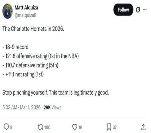 26年至今,黄蜂不仅打出121.8联盟第一的进攻效率,防守效率也提升至联盟第五的110.7,净效率+11.1同样是同期第一。