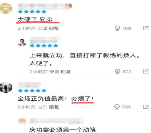 本场比赛,24岁的李弘权替补出战近28分钟,6投3中贡献9分11篮板,其中包括4个前场篮板。数据显示,当他在场时,男篮净胜对手21分,正负值全队第一,而且是全队断层式领先,是男篮逆转取胜的奇兵。球迷直言:“太硬了”、“庆功宴必须第一个动筷”。