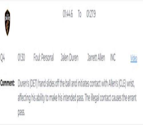 第二次是错判,发生在距离第四节结束还有48.4秒。艾伦在封盖杜伦时,手碰到的是球,这是一次没有犯规的封盖,但裁判吹了艾伦防守犯规,给了杜伦两次罚球机会。这是一次错误的判罚,依然是活塞获利,骑士吃亏。