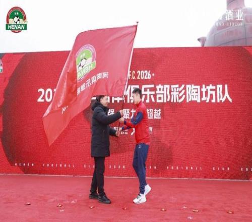 现场,河南足球队与仰韶酒业正式签约,球队将以“河南俱乐部彩陶坊队”之名征战赛场。随着河南队队长王上源接过队旗奋力挥舞,正式宣告河南彩陶坊队开启2026赛季中超新征程。