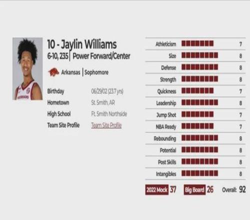 优点:一位不知疲倦的全能中锋,凭借防守意识和破坏力完美契合现代篮球风格,顶级进攻发起者,拥有出色的球场视野和精准的传球,大二赛季场均贡献2.6次助攻,能够运球突破,攻防两端灵活机动,有潜力将射程拓展到三分线外,卡位出色,具备成为一名优秀篮板手潜质,在阿肯色大学场均接近10篮板,防守意识极佳,是同届轮转换防和造进攻犯规能力最强的球员,本赛季共造成对手54次进攻犯规和48次抢断,防守全面性是他的最大优势,几乎可以防守任何位置球员,让球队防守战术可以灵活制定,在防守端起到带头作用,并拥有足够的体能进行长久作战。场均出战近32分钟,并且在控制犯规方面取得显著进步,只要在场上,就会全力以赴,并且能提升身边队友.