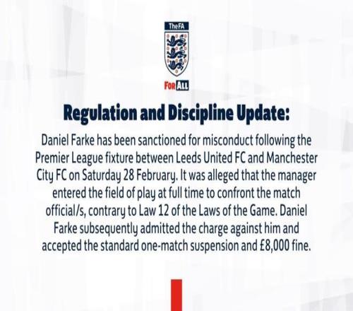 丹尼尔-法尔克因在2月28日利兹联与曼城的英超比赛后行为不当而受到处罚,据称,这位教练在比赛结束时进入场地与比赛官员对峙。