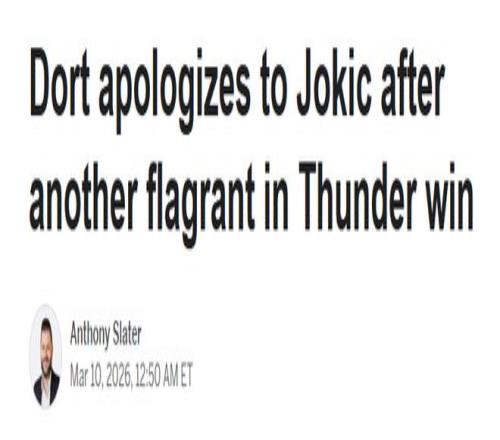 北京时间3月10日,据ESPN报道,雷霆球员多尔特承认,在两周内第二次在第四节对约基奇送出恶意犯规后,他已经向对方道歉。