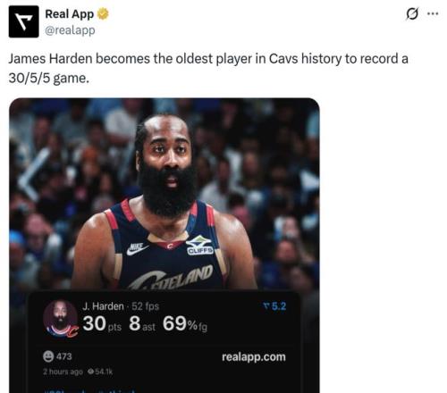 这让36岁198天的哈登成为骑士队史拿下至少30+5+5最老的球员。