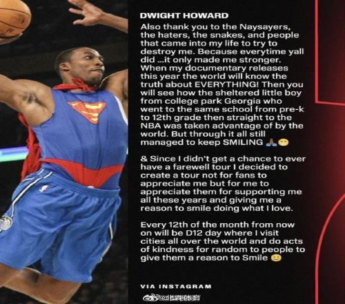 霍华德的职业生涯有无数荣誉,2004年状元秀、一次总冠军(虽然在湖人只是角色球员)、3次最佳防守球员(在魔术巅峰时期)、2008年北京奥运会冠军成员等等,但他却落选NBA75大巨星,这无疑是一大遗憾。霍华德在退役长文中表示,接下来他将策划一次全球巡演,以回馈一直以来热爱与支持他的球迷。