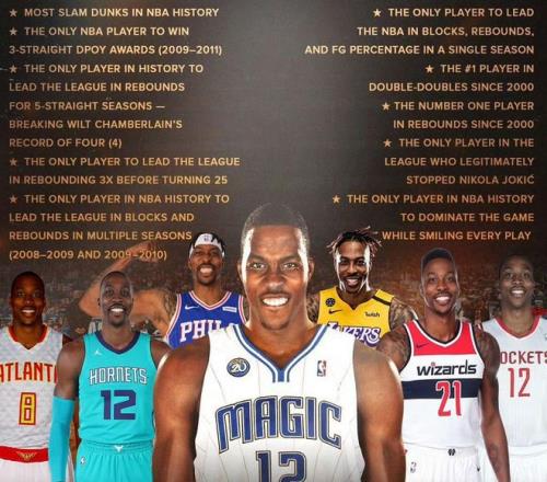 霍华德是2004年NBA状元秀,一个让姚明头疼的肌肉猛男,一个能单换詹姆斯的天赋怪,一个让23VS24巅峰对决胎死腹中的终结者。整个NBA生涯,霍华德先后效力过魔术、湖人、火箭、老鹰、黄蜂、奇才和76人等球队,他还一度在淡出NBA联盟之后不远万里前往宝岛台湾省联赛捞金,万人空巷,仿佛超人降临。
