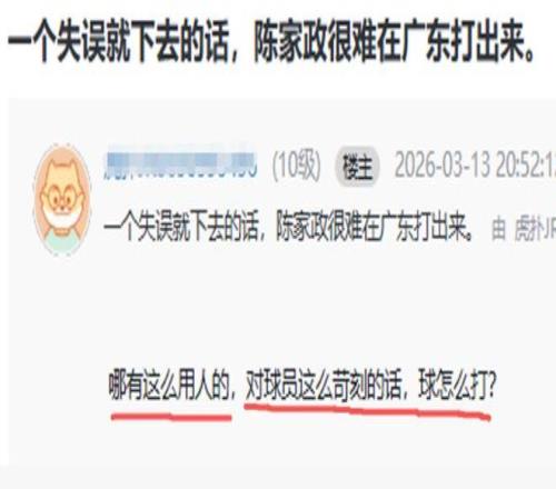 本轮广东在客场以4分险胜深圳的比赛中,陈家政打了12分钟,3中2,十分高效地拿到4分2篮板,而这4分全部来自首节。然而只是因为一个失误,杜锋就直接将陈家政换下,之后几无登场机会,这也引起了球迷的热议:“一个失误就下去的话,陈家政很难在广东打出来”、“犯一次错就被换下来,杜润旺、张皓嘉在场上纯副作用,就是不换,这要逼走队里的年轻人吗?”