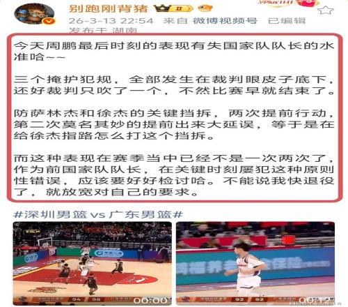 赛后,媒体人别跑刚背猪,在个人社媒发文痛斥周鹏的掩护动作,配文:今天周鹏最后时刻的表现有失国家队队长的水准哈~~三个掩护犯规,全部发生在裁判眼皮子底下,还好裁判只吹了一个,不然比赛早就结束了。防萨林杰和徐杰的关键挡拆,两次提前行动,第二次莫名其妙的提前出来大延误,等于是在给徐杰指路怎么打这个挡拆。而这种表现在赛季当中已经不是一次两次了,作为前国家队队长,在关键时刻屡犯这种原则性错误,应该要好好检讨哈。不能说我快退役了,就放宽对自己的要求。
