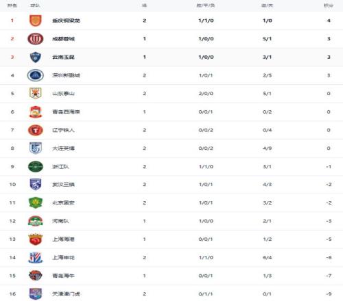 在中超积分榜,重庆铜梁龙2场拿到4分,排名暂时升到榜首位置。成都蓉城和云南玉昆都是3分,排名第2和第3名。深圳新鹏城1-0绝杀天津津门虎,拿到3分,净胜球是负数,只能排名第4。山东泰山两连胜,积分是0分,排名第5。北京国安负2分,排名第11。上海海港负5分,排名第13。上海申花则是负6分,排名倒数第3。