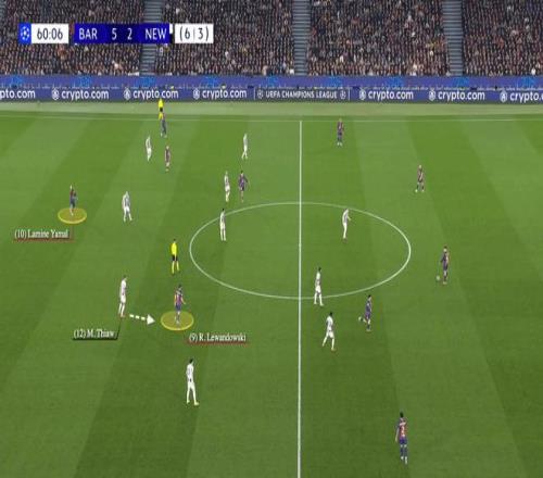 巴萨的第六粒进球,更是将纽卡防线搅得混乱不堪。马丁观察进攻选择时,莱万再度深度回撤,这次蒂奥切换防守目标盯防波兰前锋;处于越位位置的亚马尔举手要球,吸引了伯恩的注意力。
