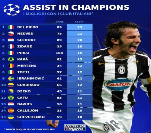 意甲球员欧冠历史助攻榜TOP15: