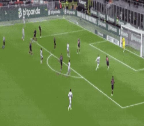 第36分钟,帕夫洛维奇外脚背撩射,皮球划过一道优美的弧线,越过门将头顶,米兰取得领先。
