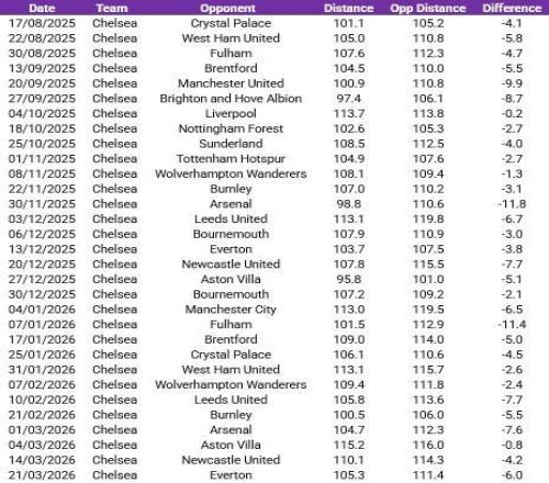 根据天空体育的统计,切尔西在本赛季每一场英超比赛中跑动距离都不及对手,同时也是全英超场均跑动数据最低的球队。