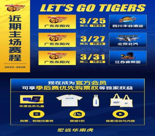 3月23日,CBA常规赛第29轮,广东东阳光将在客场挑战位居联盟之首的上海久事男篮。双方本赛季常规赛已有过2次交手,华南虎未能取胜。