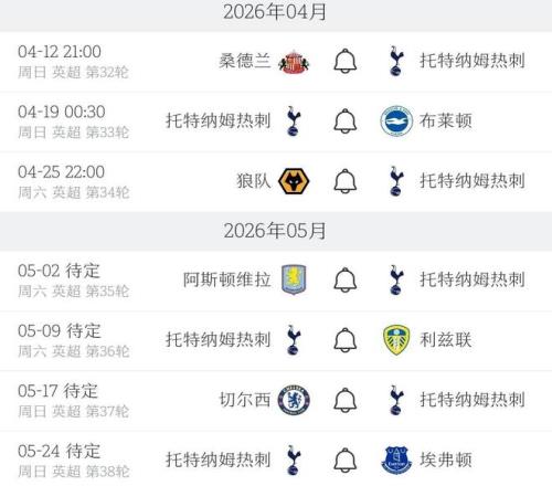 此役战罢,热刺本赛季还剩7轮英超,而他们的赛程显然并不轻松,他们需要先后面对桑德兰、布莱顿、狼队、维拉、利兹联、切尔西和埃弗顿,其中布莱顿、维拉、切尔西和埃弗顿都是目前排名积分榜上半区的球队,桑德兰也仅是以净胜球劣势位于第11。