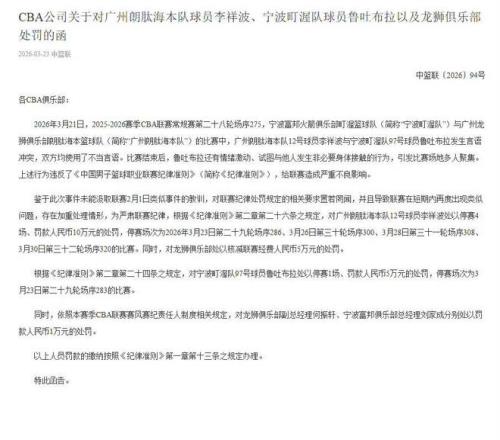 CBA公司今天开出重磅罚单:因言语冲突,广州龙狮男篮球员李祥波被停赛4场且罚款10万元,宁波男篮球员鲁吐布拉被停赛1场且罚款5万元。广州龙狮男篮被核减联赛经费5万元,副总经理何振轩被罚款1万元;宁波男篮总经理刘家成被罚款1万元。