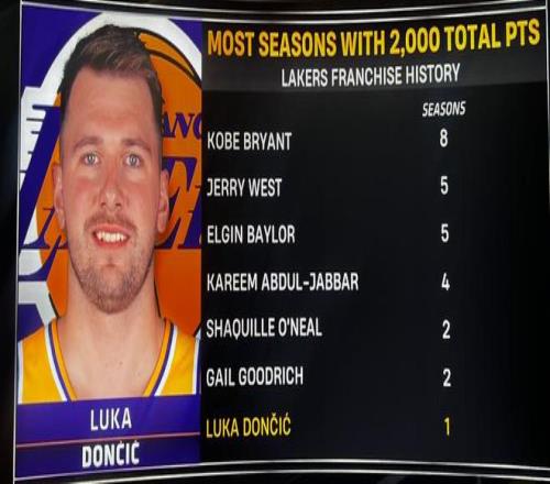 第2、此战之后,东契奇本赛季总得分为2005分,是湖人队史第七位单赛季得分突破2000的球员。前六位分别是:科比布莱恩特(8次)、杰里·韦斯特(5次)、埃尔金·贝勒(5次)、贾巴尔(4次)、奥尼尔(2次)、古德里奇(2次)。