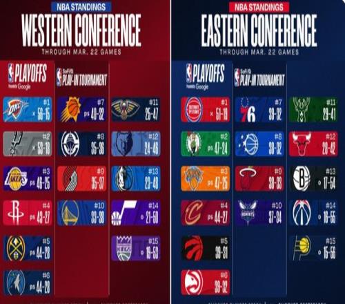 1.魔术57胜25负、2.尼克斯50胜32负、3.老鹰47胜35负、4.步行者47胜35负、5.猛龙46胜36负、6.雄鹿44胜38负、7.骑士44胜38负、8.热火42胜40负、9.公牛41胜41负、10.凯尔特人40胜42负、11.76人37胜45负、12.活塞36胜46负、13.黄蜂23胜59负、14.篮网13胜69负、15.奇才12胜70负