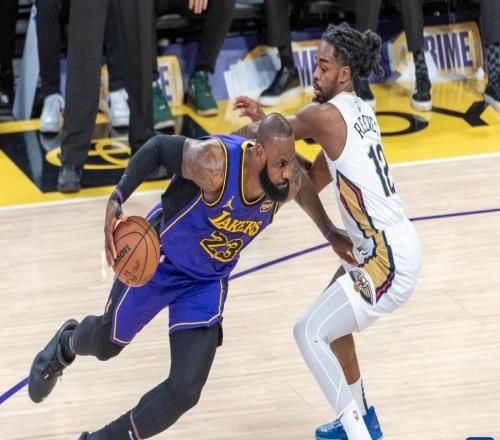 洛杉矶湖人队前锋勒布朗・詹姆斯(23号)将因左脚关节炎,缺席周二对阵圣安东尼奥马刺的比赛,这一缺阵也让他彻底失...