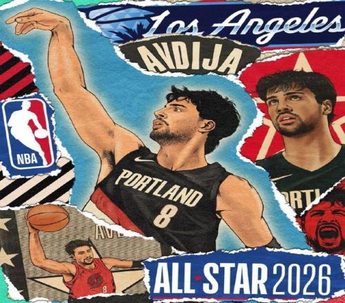 开拓者主场球迷鼓掌祝贺阿夫迪亚首次入选全明星,阿夫迪亚起立致谢,杨瀚森在一旁鼓掌祝贺。
